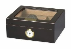 Protect and age 25-50 fine cigars in the finely crafted 50 Cigar Mahogany Humidor. Features a divided interior for versatility and a hygrometer visible from the outside that makes it easy to check the humidity level. Simple clean styling with scratch resistant felt lined bottom.