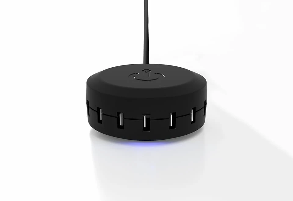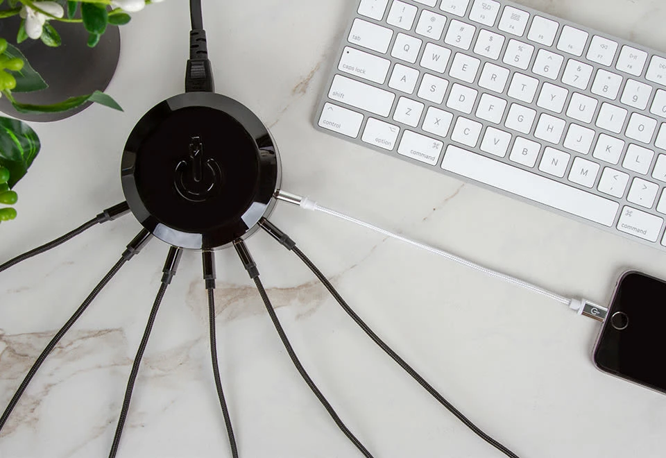 Simplify your household charging needs with the sleek and compact 7 Device Charger. It charges up to 7 devices from a single AC outlet.
