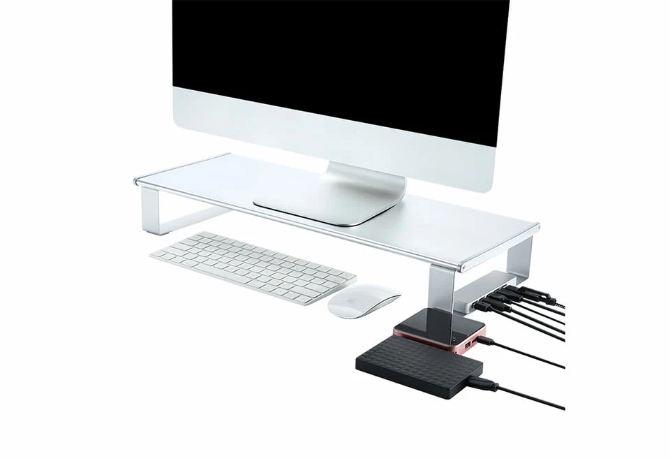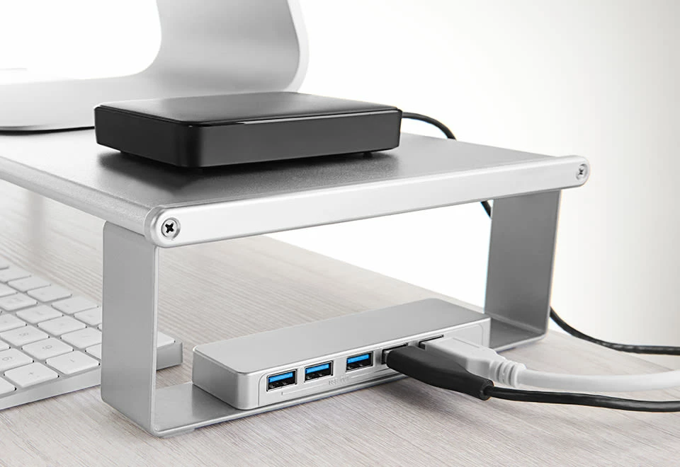 The Monitor Stand with USB Hub saves valuable desk space and powers your essentials for ergonomic comfort and efficiency.