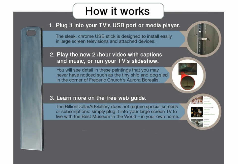 Turn your living room into a world-class gallery with the Personal Virtual Art Museum. This USB flash drive plugs into your TV to display 500 classic paintings in 4K High Definition.
